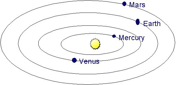 The table below contains some information about the three closest planets to the Sun (including the Earth). This can be useful in understanding why and when planetary transits occur. The first column lists the planet name, the second its diameter in kilometres. We can see that Venus is about the same size as the earth, while Mercury is substantially smaller. The third column lists the time in (Earth) days that it takes for the planet to complete one orbit around the Sun - this is the length of the planet's year. The fourth column is the average distance of the planet from the Sun.