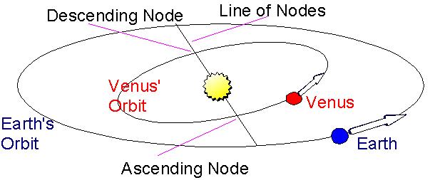 Exactly the same thing happens in the case of Venus. The synodic period of Venus as observed from Earth (that is, the time between one conjunction and the next) is about 584 days (compared with 116 days for Mercury). However, because the orbit of Venus it tilted at 3.4 degrees with respect to the Earth's orbit, during most of these conjunctions, Venus passes either to the north or to the south of the Sun. Only when Venus is close to a node (the point at which the Venusian orbit crosses the plane of the Earth's orbit) will a transit of Venus be visible to people on the Earth. Now, Venus has both an ascending node and a descending node. The former is when Venus is travelling from south to north in its orbital motion, and the latter is when it is proceeding from north to south.