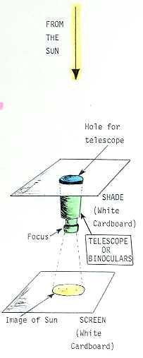On June 8, 2004, the Sun will subtend an angle of 1890 arc seconds or 31.5 arc minutes to an observer on the Earth. This is just a little over half a degree. In contrast, Venus will only subtend an angle of about 58 seconds of arc. This is 1/32 or about 0.03 times the apparent diameter of the Sun. To observe Venus against the solar disc in projection, a small telescope (or a pair of binoculars) will be needed. Almost any small telescope will do - these are often available from department stores for $10 to $30. The setup is shown in the diagram below. A shade made out of cardboard or light plywood has a small hole cut in the centre, and the telescope or binoculars are affixed behind this hole. This is pointed toward the Sun and the focus of the telescope is adjusted so that a sharp image of the Sun is seen on the screen (white cardboard or white paper on plywood) placed at some distance behind the eyepiece. Adjust the distances between the telescope and screen so that an image of around 50 millimetres (or larger) in diameter is obtained. This will then provide sufficient resolution to see Venus move across the face of the Sun. You will find it a lot easier to handle if you mount the shade and screen on a framework so that they can be moved together to track the Sun as it moves across the sky.
