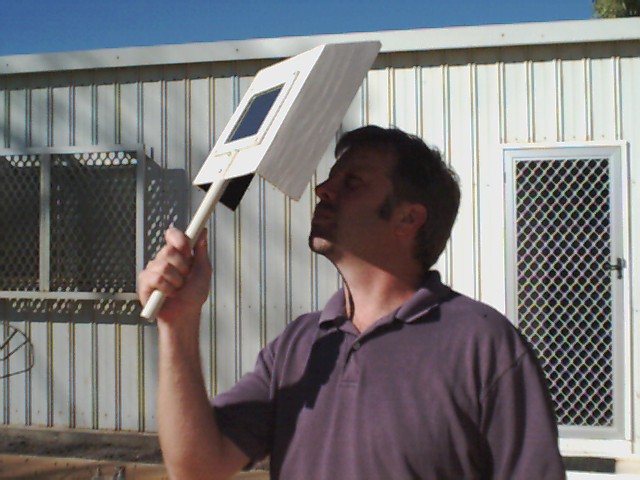 If you don't feel up to making a projection device, it is just possible to view the transit through a SAFE solar filter. There are basically only two types of solar filter that you should consider. The first are mylar filters sold by astronomy shops specifically for solar viewing. Look in the Australian "Sky and Space" magazine (often available at newsagents) for addresses of astronomy suppliers. The second type of filter is a shade 14 welder's filter. Do not be tempted to use anything less than a shade 14 (such as the commonly available shade 12 used in most arc welding). A hardware shop or engineering supply shop may be able to order shade 14 filters for you. There are basically two types. The cheaper type ($A5) made of glass will give the Sun a greenish look, and may show distortions in the solar image, because the glass is not optical quality. The better quality filters are gold coated on plastic (and cost around $A30), and sometimes go under the name "Omniview". This latter filter gives a slight orange cast to the Sun, which looks more natural. Whatever filter you use, look after it carefully. Do not allow it be scratched or damaged in any way, as this can compromise your safety.